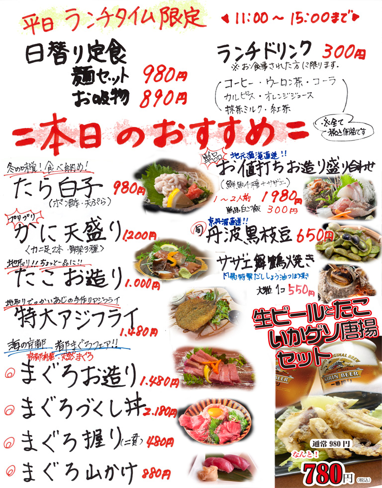 tab20241225⑬飲み物B.jpg202405⑬飲み物税別.jpgtab20241222お造りサラダ焼き物.jpgtab241222揚げ物お寿司A4.jpg表示価格、メニュー内容は店舗内との違いがあります、詳しくはお問合せ下さい。tabTOメニューA20241222.jpg